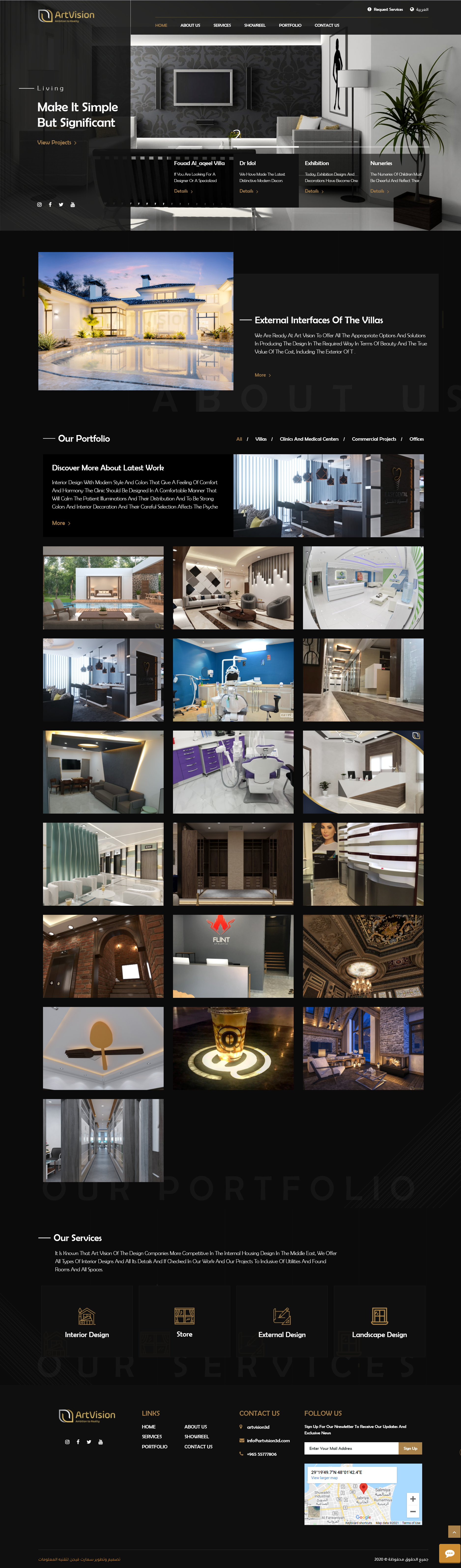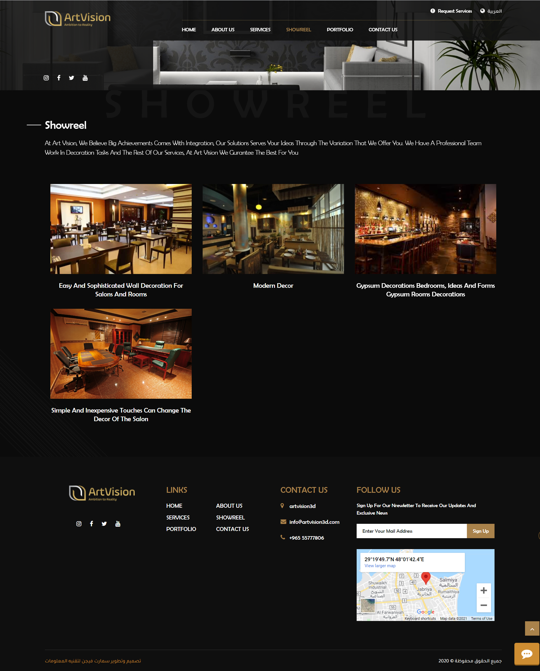 ارت فيجن شركه تصميم ديكور داخلى متكامله الخدمات تأسست 2008 فى الكويت ، متخصصه فى كل من التصميم السكنى والتجارى ، على مدار اكثر من 10 سنوات قمنا بتصميم وتنفيذ عدد كبير من المشاريع للعملاء لاننا نؤمن بأنها علاقه طويله الامد بين الشركه والعميل لذلك يواصل العملاء العمل معا بشكل مستمر