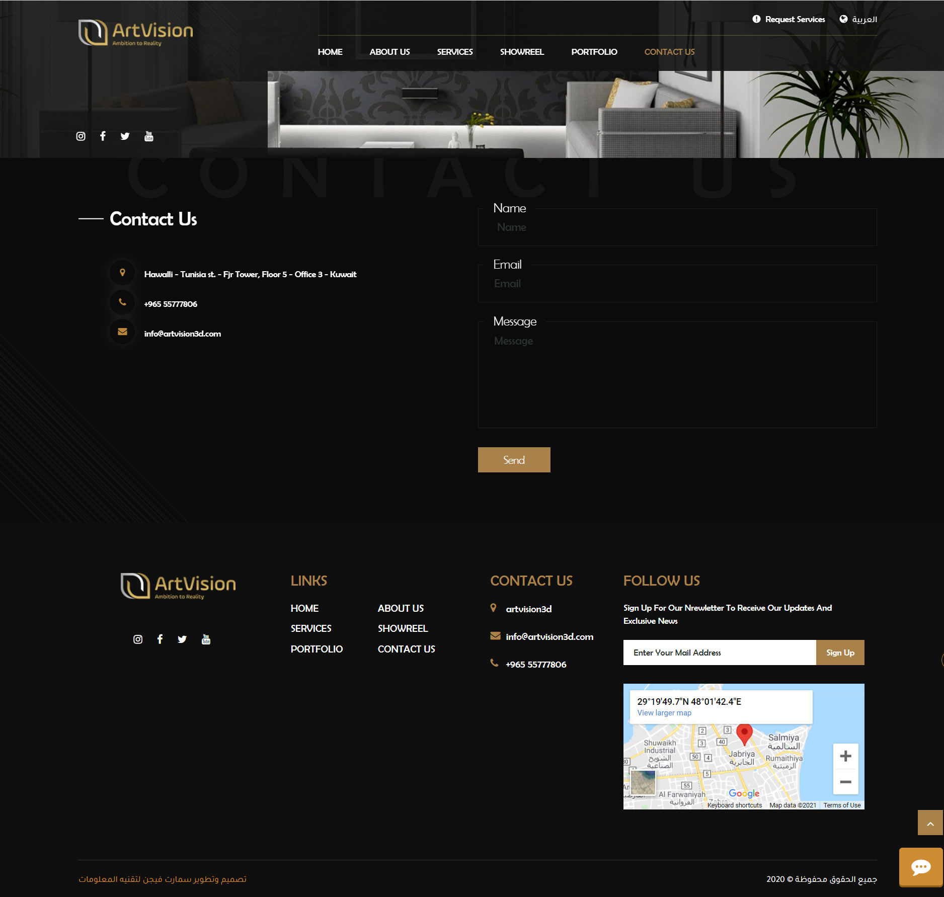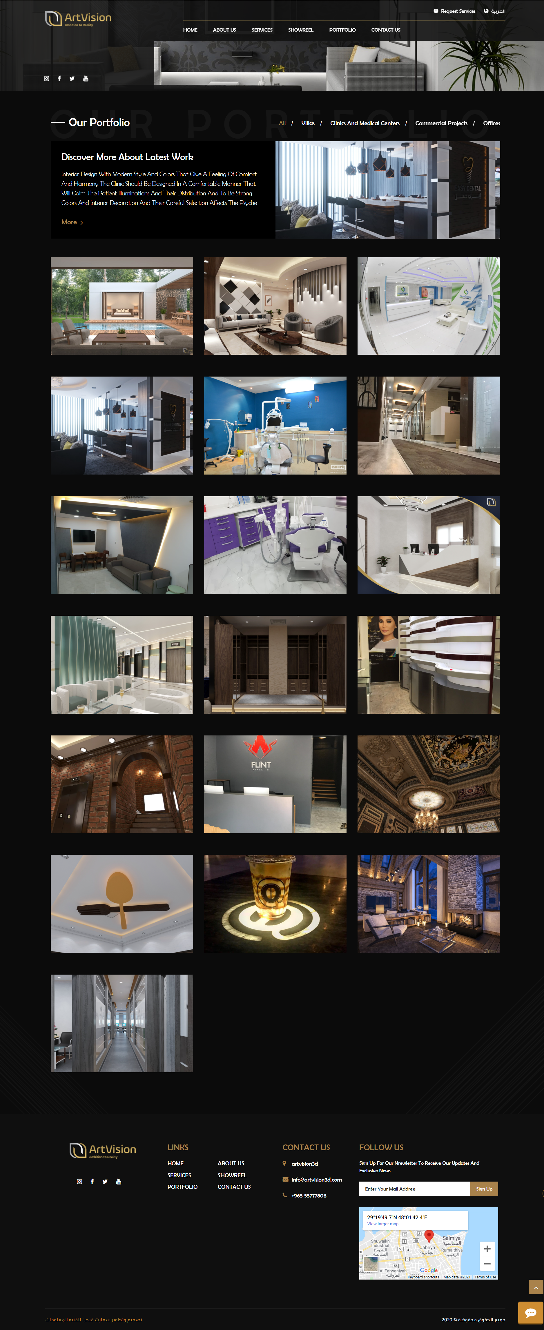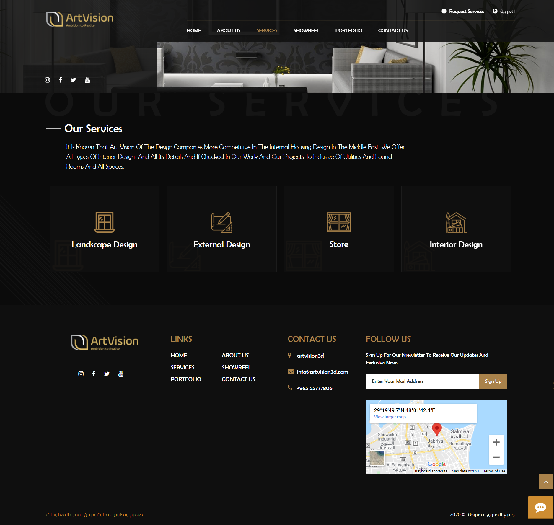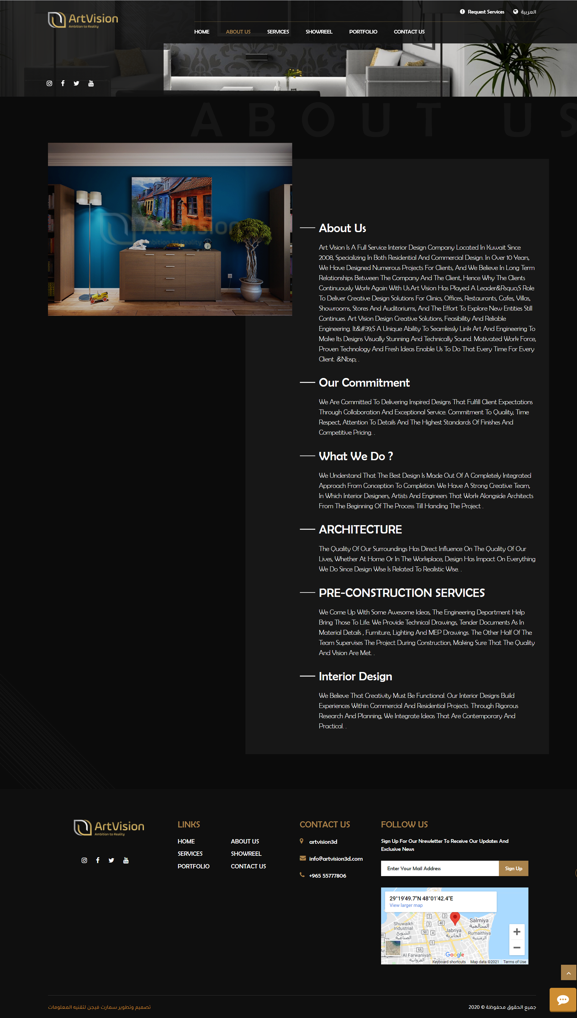ارت فيجن شركه تصميم ديكور داخلى متكامله الخدمات تأسست 2008 فى الكويت ، متخصصه فى كل من التصميم السكنى والتجارى ، على مدار اكثر من 10 سنوات قمنا بتصميم وتنفيذ عدد كبير من المشاريع للعملاء لاننا نؤمن بأنها علاقه طويله الامد بين الشركه والعميل لذلك يواصل العملاء العمل معا بشكل مستمر